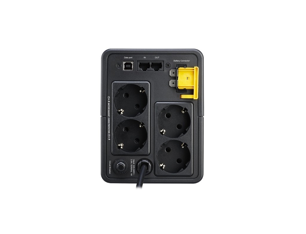 Το Back-UPS 1600VA Line-Interactive 900W με 4 Schuko Πρίζες της APC είναι ένα Tower UPS. Διαθέτει 4 πρίζες τύπου Schuko καθώς και υποδοχή και έξοδο για καλώδιο ethernet προστατεύοντας τις συσκευές που συνδέονται με αυτό π.χ. router (εφόσον είναι συνδεδεμένη και η τροφοδοσία τους σε UPS ή πολύπριζο ασφαλείας). Η λειτουργία του είναι (VI) Line-Interactive που προσαρμόζει την τάση εξόδου συνεχώς μέσω αυτόματου ρυθμιστή τάσης προστατεύοντας από αυξομειώσεις της τάσης και διακοπές του ρεύματος. Η μπαταρία του μπορεί να κρατήσει 7 λεπτά με μισό φορτίο ή 1 λεπτό με πλήρες φορτίο (όταν οι συσκευές που είναι συνδεδεμένες τραβάνε το μισό ή το μέγιστο ρεύμα που μπορεί να δώσει το UPS αντίστοιχα).- Κατασκευαστής: APC
