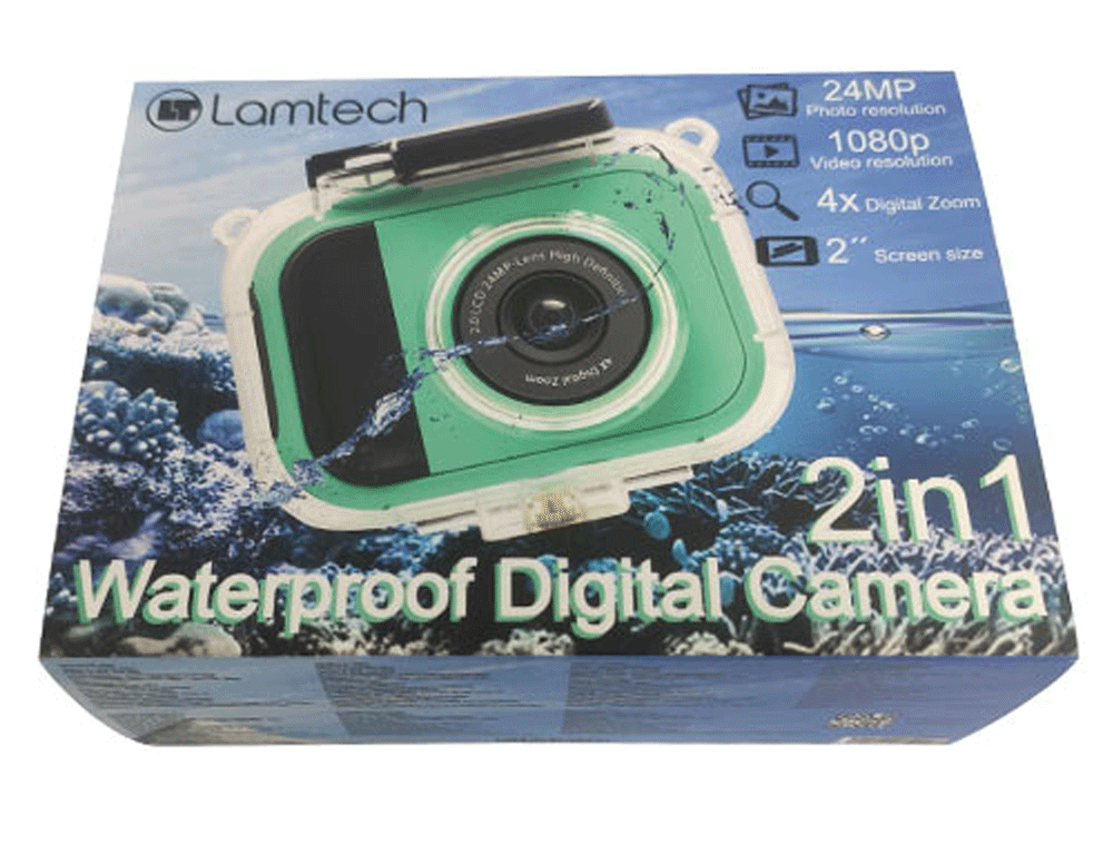 Ψηφιακή κάμερα από την Lamtech σε πράσινο χρώμα με αδιάβροχη θήκη. Υποστηρίζει Loop recording & Sport mode και κάρτα μνήμης micro-SD 32 GB. Διαθέτει ενσωματωμένη επαναφορτιζόμενη μπαταρία Li-ion 650mAh. Ανάλυση φωτογραφίας έως 24MP και ανάλυση βίντεο 1920 x 1080 στα 15fps.