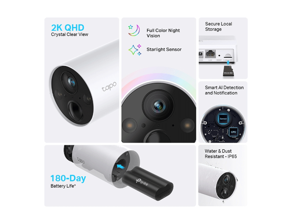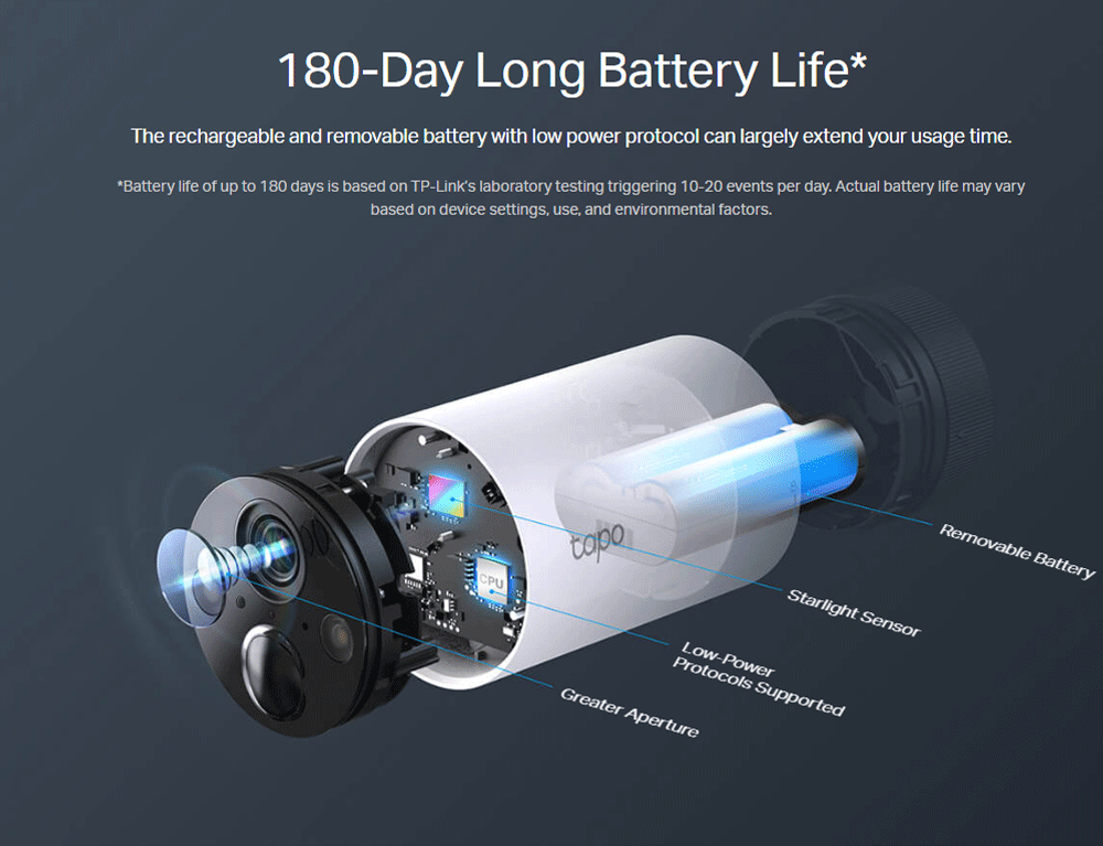 {*Η διάρκεια ζωής της μπαταρίας έως και 180 ημέρες βασίζεται στον εργαστηριακό έλεγχο της TP-Link που ενεργοποιεί 10-20 συμβάντα την ημέρα. Η πραγματική διάρκεια ζωής της μπαταρίας μπορεί να διαφέρει ανάλογα με τις ρυθμίσεις της συσκευής, τη χρήση και τους περιβαλλοντικούς παράγοντες.