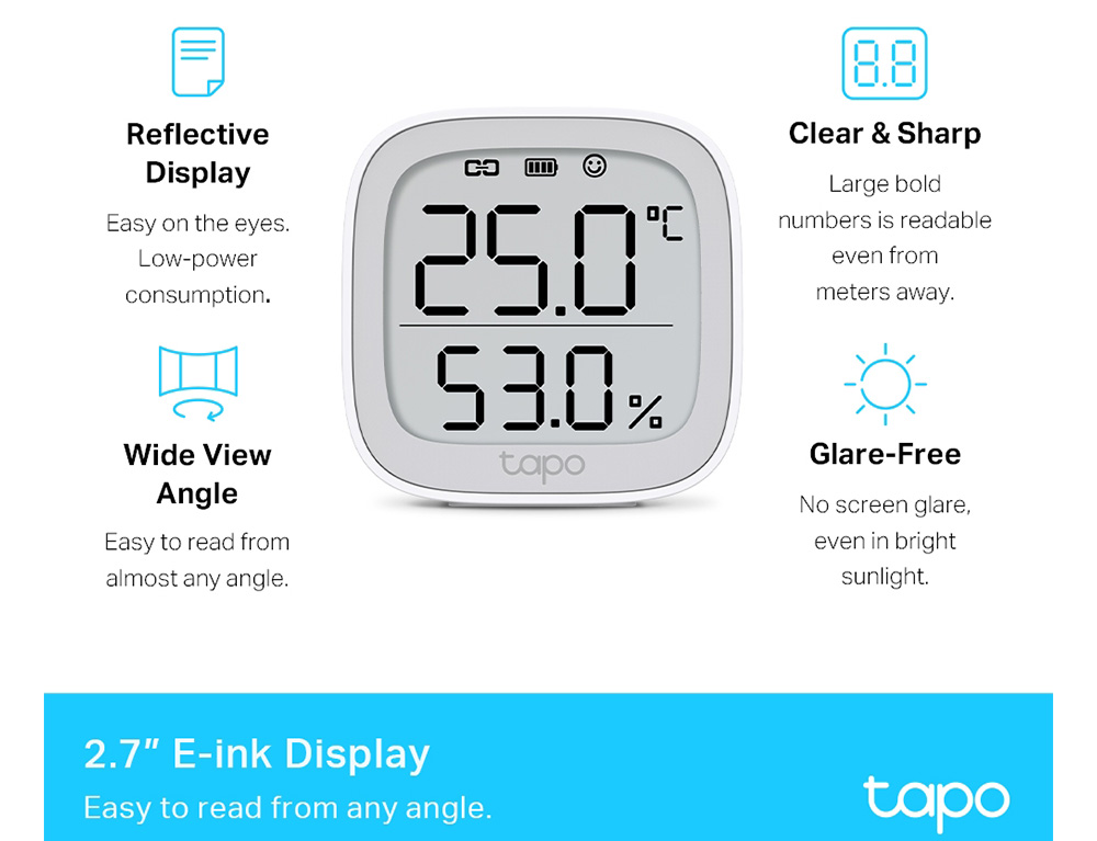 - Οθόνη 2,7" E-ink - Υποδεικνύει τη θερμοκρασία και την υγρασία, το επίπεδο άνεσης με εκφράσεις του προσώπου, την κατάσταση της μπαταρίας και το σήμα.