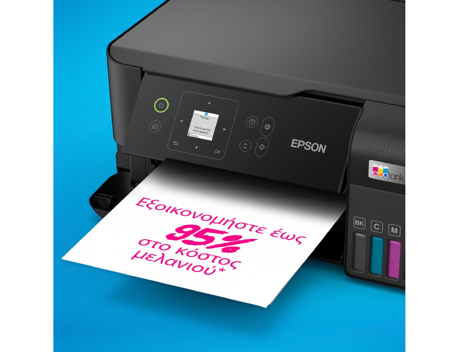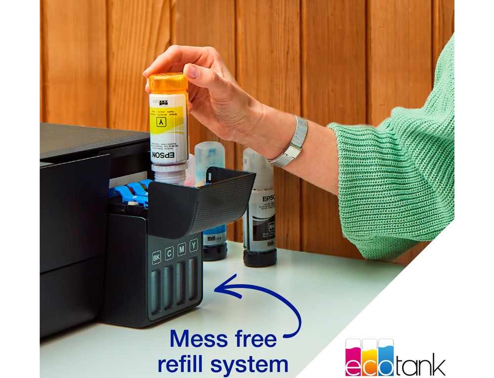 Ιδανικός για σύγχρονα οικιακά περιβάλλοντα με συχνές ανάγκες εκτύπωσης, αυτός ο εκτυπωτής inkjet A4 έχει εύχρηστη οθόνη, επαναγεμιζόμενα δοχεία μελανιού και έως και 63 cartidges σε ένα σετ ανταλλακτικών φιαλιδίων* για εξαιρετικά χαμηλό κόστος εκτύπωσης ανά σελίδα. Οι οικιακές λειτουργίες περιλαμβάνουν Wi-Fi, σάρωση και αντιγραφή.
