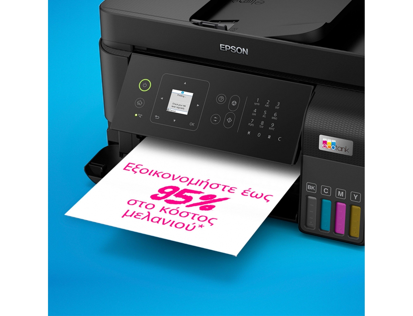 Εξοικονόμησε έως 95% στο κόστος εκτύπωσης με τους εκτυπωτές EcoTank της Epson χωρίς φύσιγγες μελανιών. Διαθέτοντας φιαλίδια μελανιού υψηλής απόδοσης, τα ενσωματωμένα δοχεία μελανιού γεμίζουν εύκολα χάρη στα ειδικά σχεδιασμένα φιαλίδια μελανιού. Χωρίς φύσιγγες μελανιών για αντικατάσταση, με ευέλικτες δυνατότητες διασύνδεσης και φαξ, είναι ο ιδανικός εκτυπωτής για όσους αναζητούν εκτυπώσεις υψηλής ποιότητας σε απίστευτα χαμηλό κόστος ανά σελίδα.