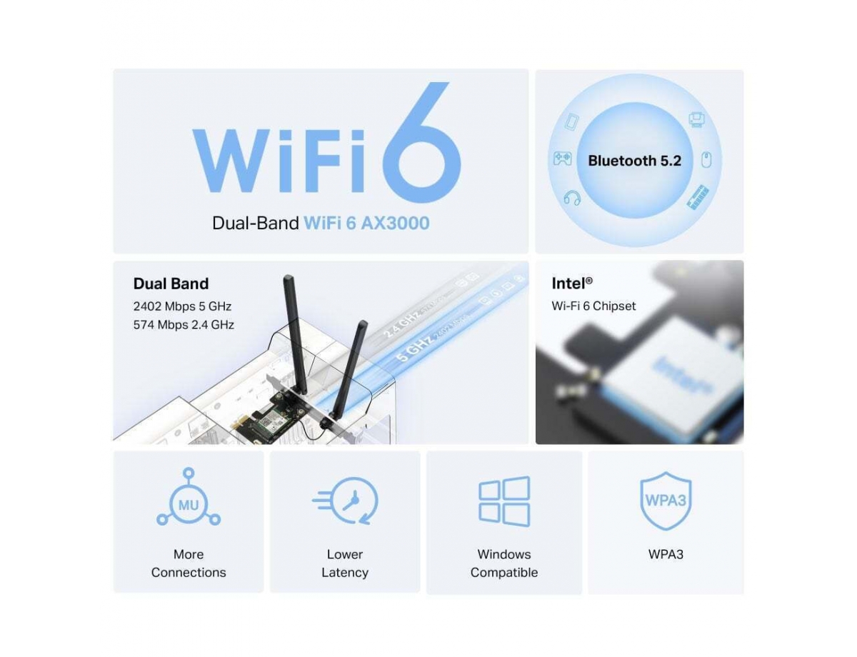 είναι μια προηγμένη PCIe κάρτα που προσφέρει εντυπωσιακή απόδοση και συνδεσιμότητα με τις τελευταίες τεχνολογίες Wi-Fi 6 και Bluetooth 5.2.