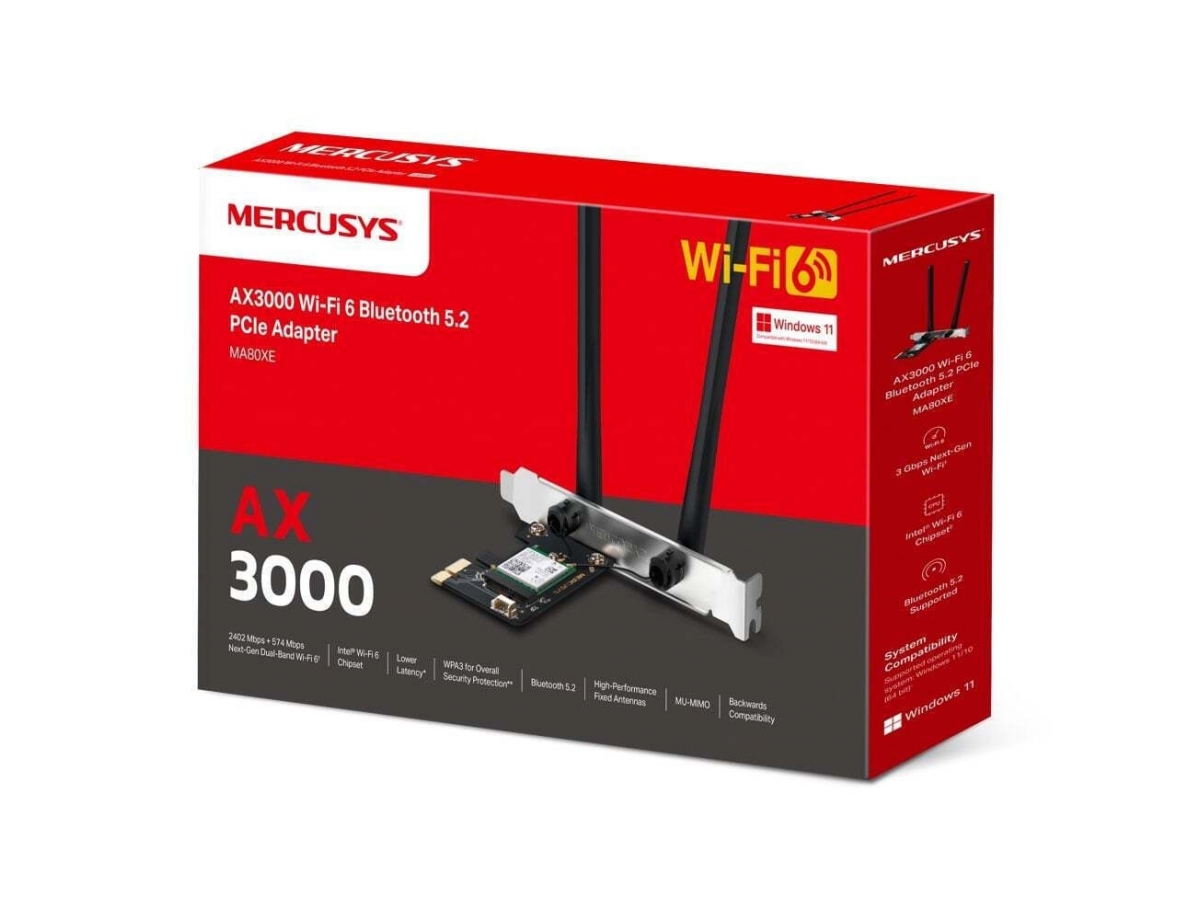 Η ασύρματη κάρτα δικτύου Mercusys MA80XE είναι μια προηγμένη PCIe κάρτα που προσφέρει εντυπωσιακή απόδοση και συνδεσιμότητα με τις τελευταίες τεχνολογίες Wi-Fi 6 και Bluetooth 5.2.
