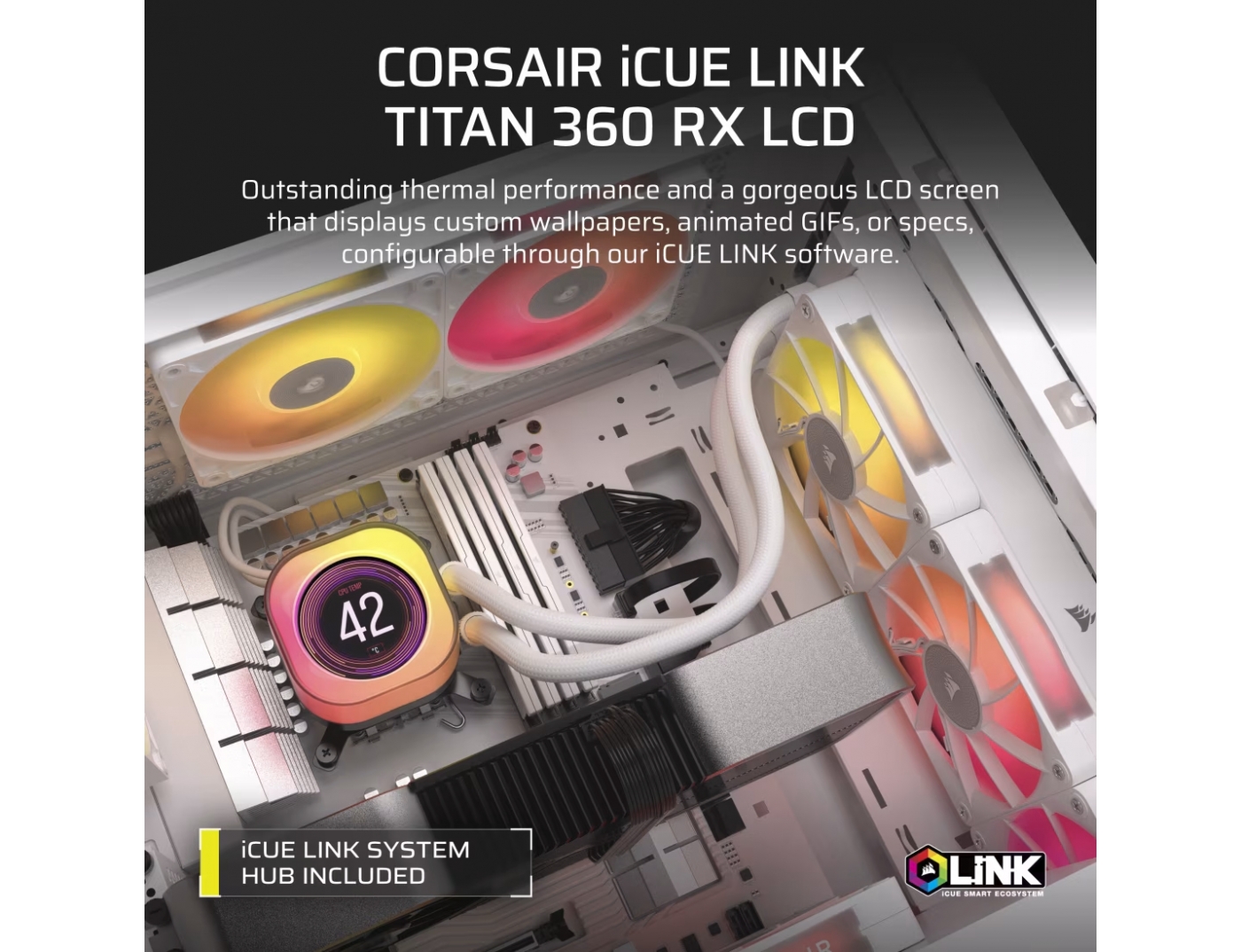 Η CORSAIR iCUE LINK TITAN RX LCD προσφέρει ψύξη υψηλής απόδοσης, εξαιρετικά αθόρυβη ψύξη με βελτιστοποιημένη θερμική απόδοση, βελτιωμένη συνδεσιμότητα iCUE LINK και δυναμικό φωτισμό RGB.