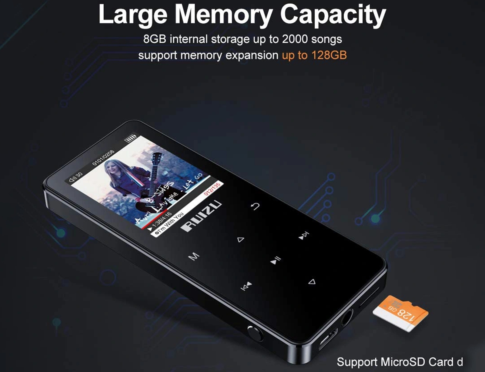 Απολαύστε την αγαπημένη σας μουσική και βίντεο στο MP3 D51 της Ruizu. Διαθέτει έγχρωμη οθόνη 1.8'', πλήκτρα αφής και ενσωματωμένο ηχείο. Υποστηρίζει ελληνικό μενού και μπορεί να συνδεθεί με ακουστικά ή ηχεία, ενσύρματα, μέσω της θύρας 3.5mm ή ασύρματα, μέσω Bluetooth. Διαθέτει ενσωματωμένη μνήμη 8GB, η οποία σας επιτρέπει να αποθηκεύετε αρχεία βίντεο, μουσικής και φωτογραφιών ενώ σας δίνει την δυνατότητα επέκτασης της μνήμης χάρη στην υποδοχή micro SD που διαθέτει.