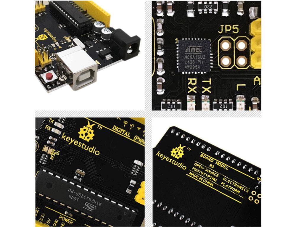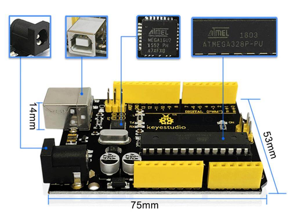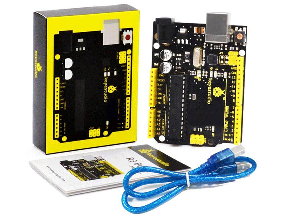 UNO R3 development board της Keyestudio, πλήρως συμβατό με το Arduino UNO REV3. Διαθέτει 14 ψηφιακούς ακροδέκτες εισόδου/εξόδου (εκ των οποίων οι 6 μπορούν να χρησιμοποιηθούν ως έξοδοι PWM), 6 αναλογικές εισόδους, 16MHz ceramic resonator, USB connection, υποδοχή τροφοδοσίας, ICSP header και κουμπί επαναφοράς. Υπάρχουν 2 αυτόματα εναλλάξιμες επιλογές για το σύστημα τροφοδοσίας Arduino UNO, άμεση τροφοδοσία μέσω USB ή εξωτερική τροφοδοσία που μπορεί να είναι αντάπτορας AC-σε-DC ή μπαταρία. Στην συσκευασία συμπεριλαμβάνεται καλώδιο USB τροφοδοσίας.