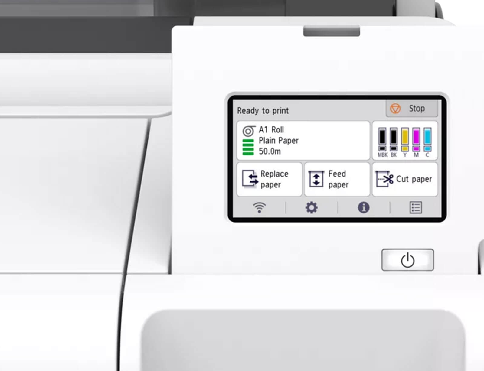 Λειτουργική σχεδίαση με οθόνη αφής 4,3" όπου εμφανίζονται χρήσιμες οδηγίες και σημαντικές πληροφορίες, όπως ο τύπος του υλικού εκτύπωσης και η ποσότητα υλικού και μελανιού που απομένει. Το ρολό χαρτιού μπορεί να αντικατασταθεί με ευκολία στο κάλυμμα με την επίπεδη επάνω επιφάνεια.