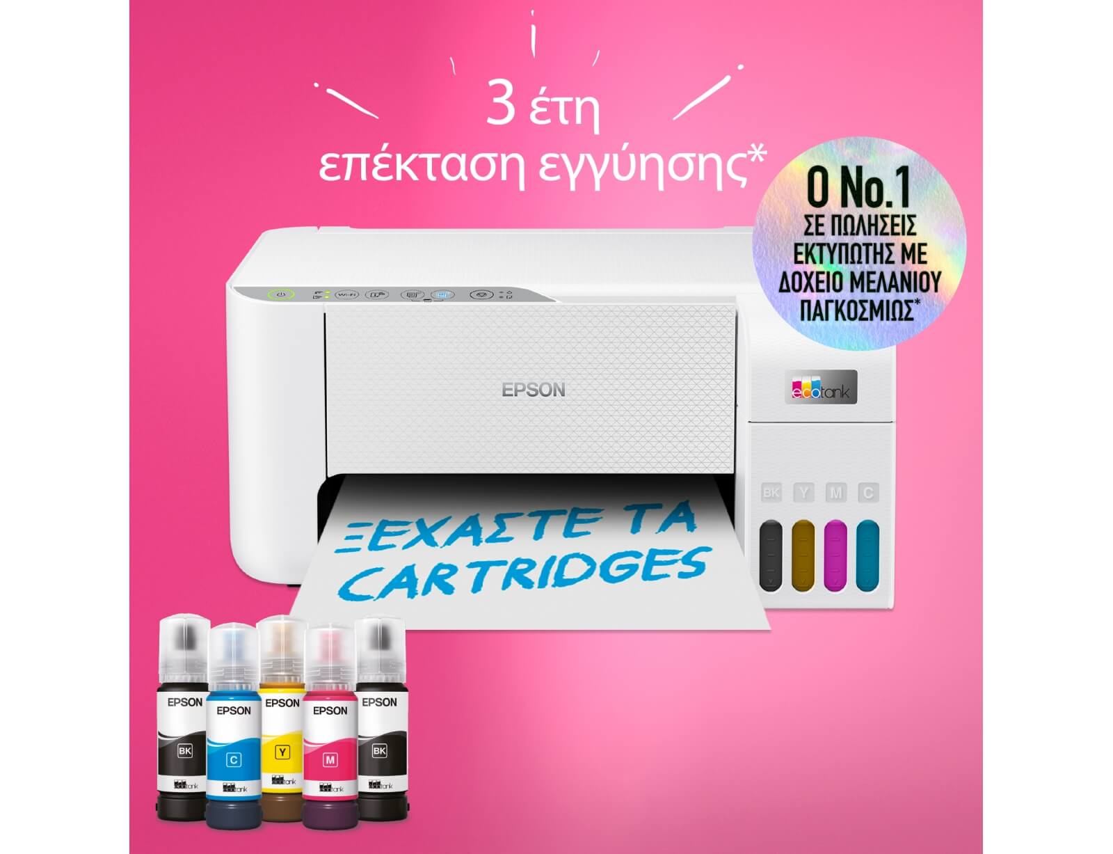 Αυτός ο οικονομικός εκτυπωτής μειώνει το κόστος εκτύπωσης έως 95% και περιλαμβάνει στη συσκευασία μελάνι που καλύπτει τις ανάγκες σας για έως 3 έτη. Εκτυπώστε έως 8.100 ασπρόμαυρες και 6.500 έγχρωμες σελίδες.