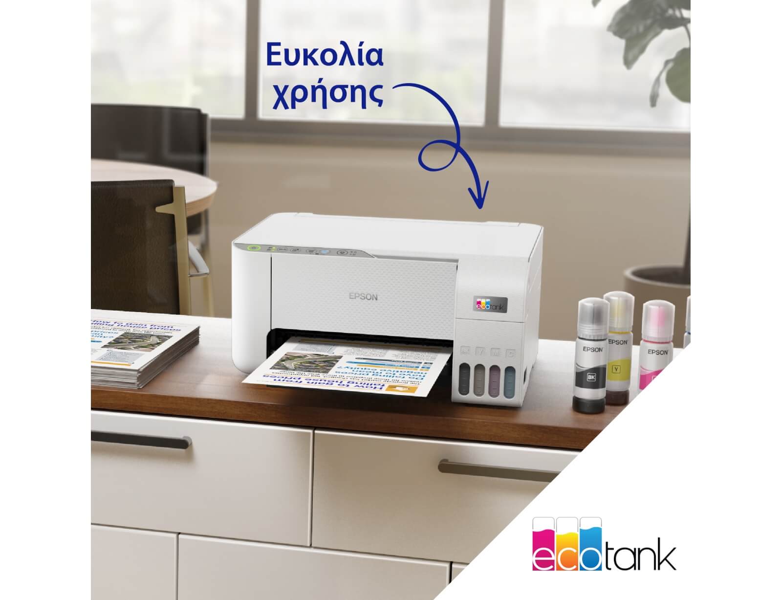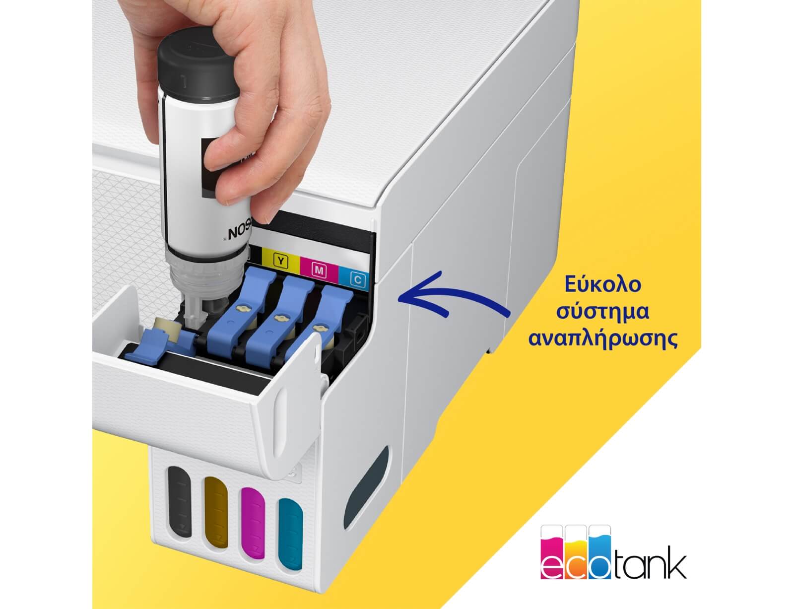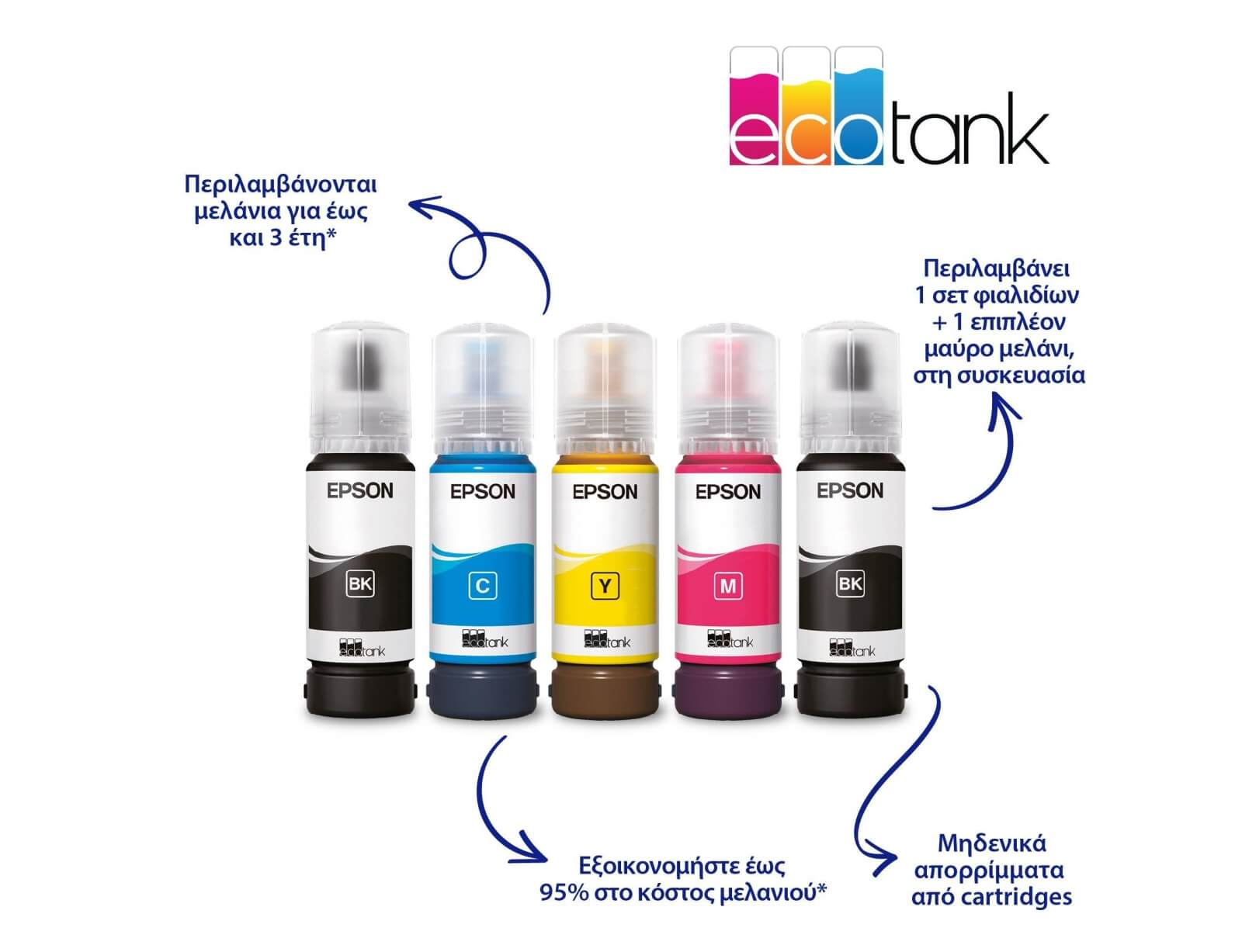 Οι εκτυπωτές EcoTank παρέχουν οικιακές εκτυπώσεις χωρίς ταλαιπωρία: Χάρη στην εξαιρετικά υψηλή χωρητικότητα τους, τα δοχεία μελανιών επιτρέπουν την εύκολη αναπλήρωση, ενώ τα φιαλίδια διαθέτουν σχεδιασμό κλειδώματος, έτσι ώστε να μπορεί να τοποθετηθεί μόνο το σωστό χρώμα. Χάρη στην μπροστινή οθόνη στάθμης μελανιού, είναι εύκολο να βλέπετε πότε απαιτείται αναπλήρωση.