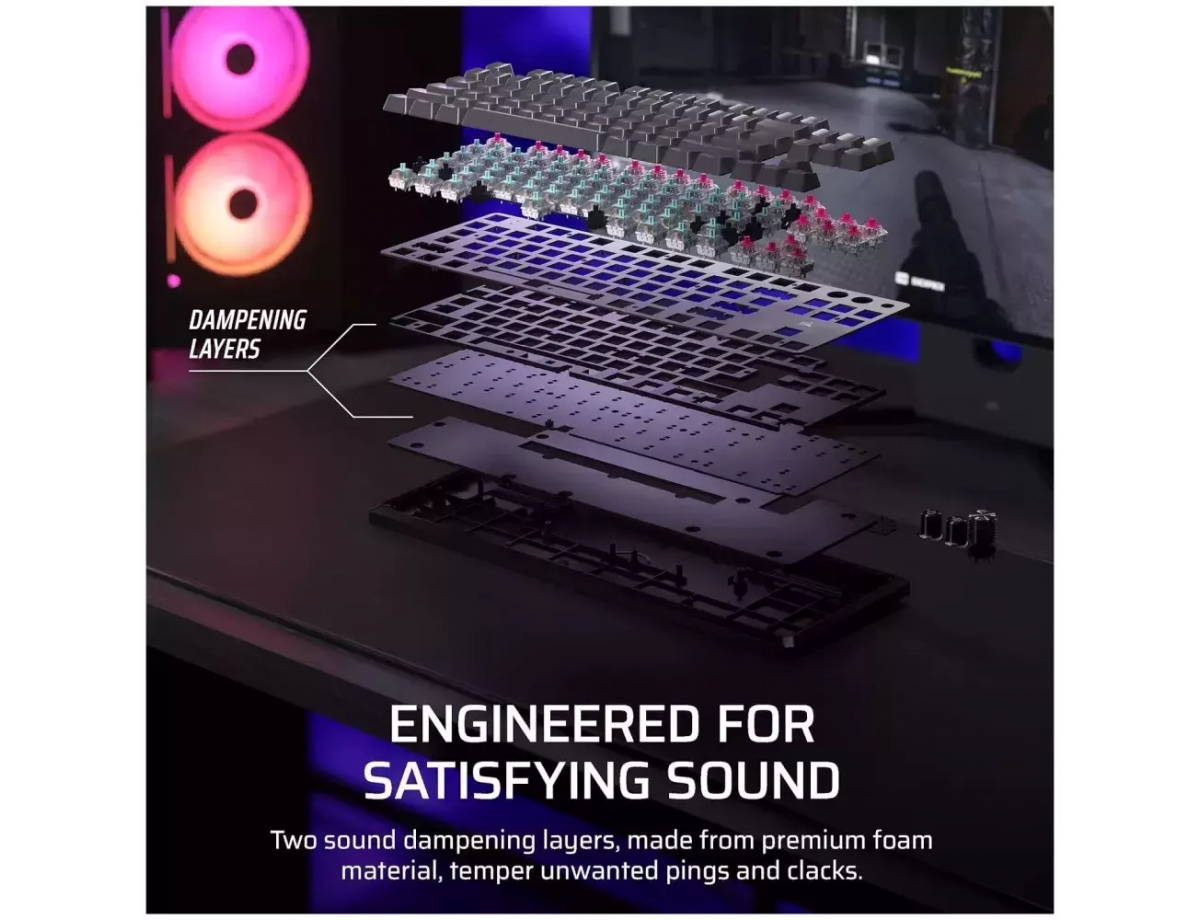 Το K70 PRO TKL έχει περισσότερα από όσα βλέπει το μάτι - ή το αυτί. Δύο στρώματα απόσβεσης του ήχου από σιλικόνη υψηλής ποιότητας, καθώς και προ-λιπαινόμενοι σταθεροποιητές, μετριάζουν τα ανεπιθύμητα pings και clacks για πιο ικανοποιητική, μαλακή πληκτρολόγηση.