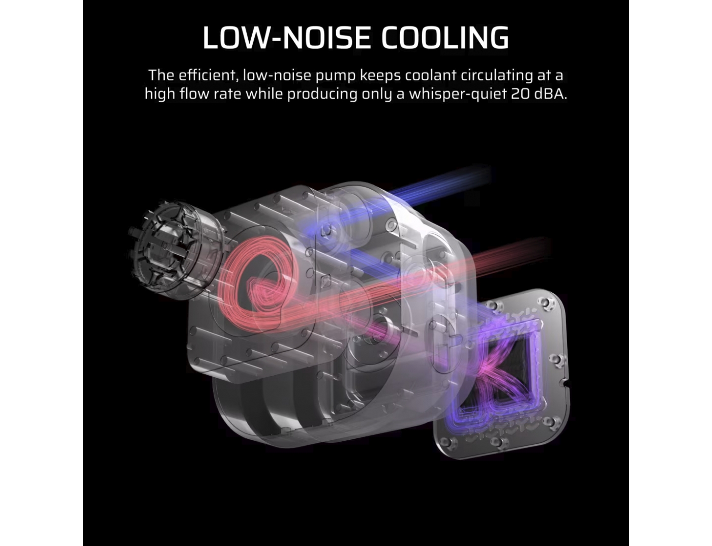 Η αποδοτική, χαμηλού θορύβου αντλία κυκλοφορεί ψυκτικό υγρό με υψηλό ρυθμό ροής σε ένα αθόρυβο επίπεδο 20 dBA. Ο έλεγχος PWM σάς επιτρέπει να ρυθμίζετε την ταχύτητα του ανεμιστήρα έως και 2.100 στροφές ανά λεπτό, με υποστήριξη της λειτουργίας Zero RPM για αθόρυβη λειτουργία.
