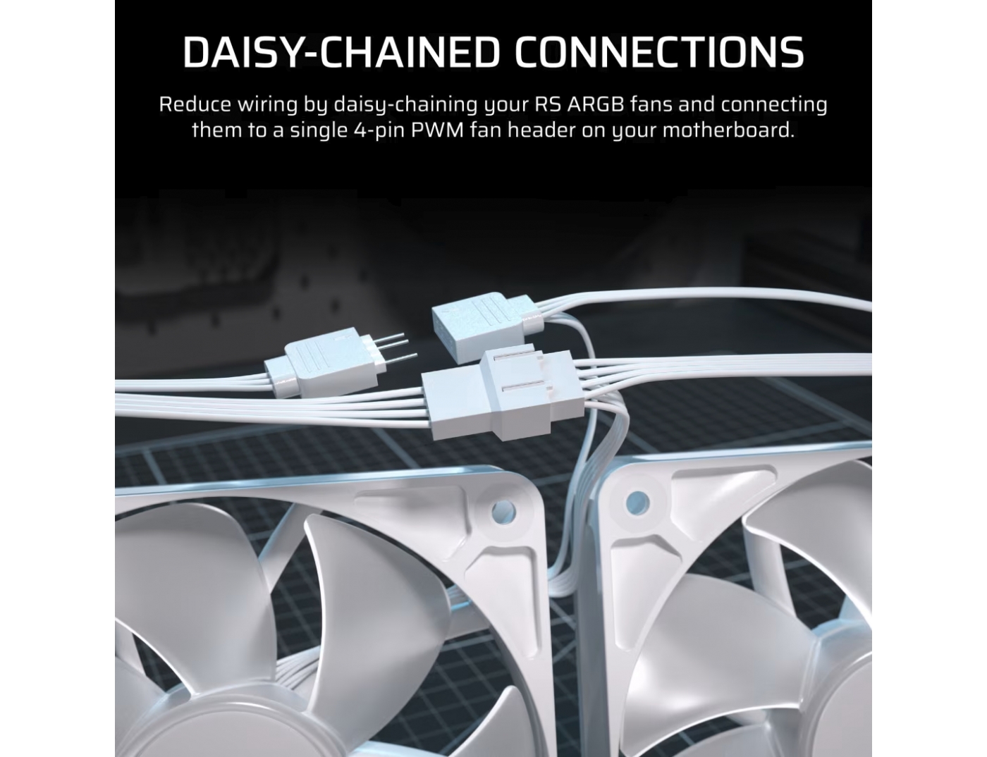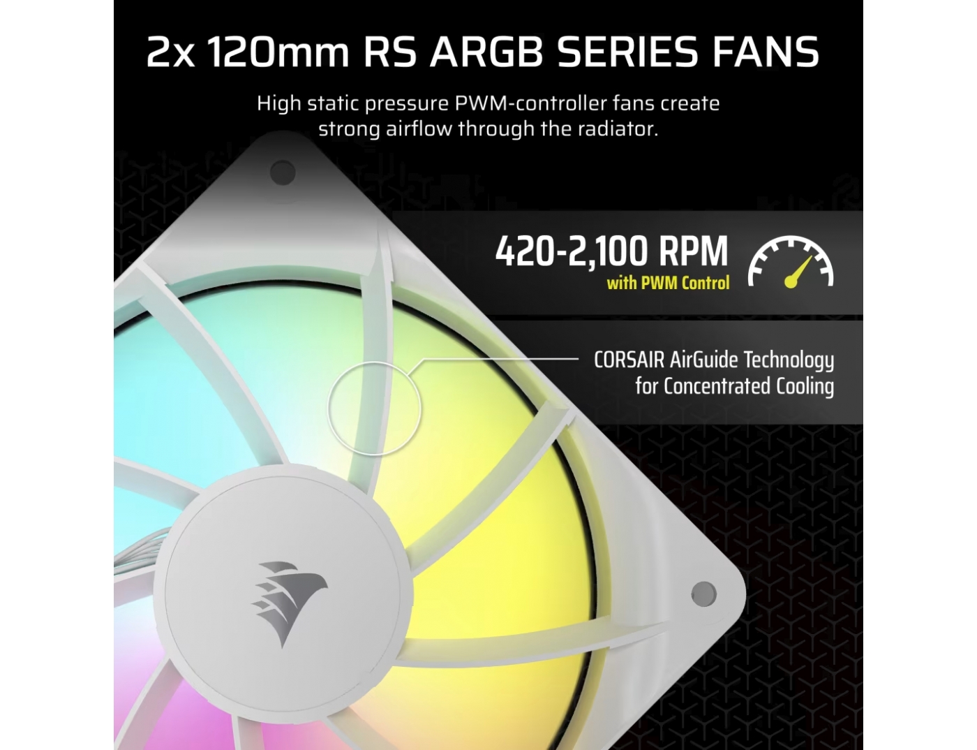 Οι ανεμιστήρες RS120 ARGB παρέχουν ισχυρή ροή αέρα με υψηλή στατική πίεση για να ωθήσουν τον αέρα μέσα από το ψυγείο. Η τεχνολογία CORSAIR AirGuide και τα ρουλεμάν Magnetic Dome εξασφαλίζουν εξαιρετική απόδοση ψύξης, ενώ ο θόρυβος διατηρείται στο ελάχιστο.