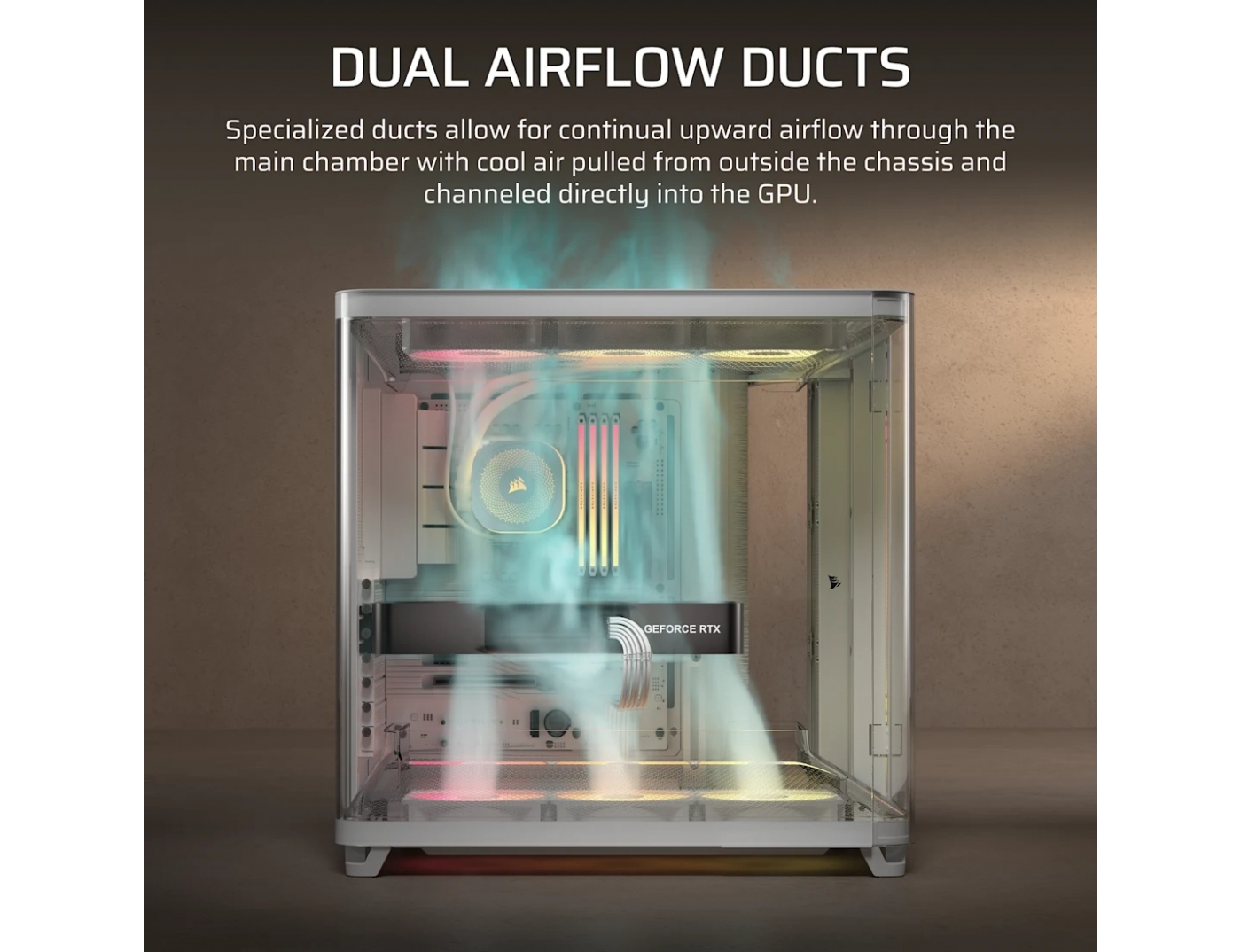 το ευρύχωρο εσωτερικό σχεδιάστηκε ειδικά για τις πιο ισχυρές gpu, με άφθονο χώρο για να αναπνέουν και διπλούς αγωγούς ροής αέρα για να διοχετεύουν δροσερό αέρα μέσω της gpu για μέγιστη απόδοση.