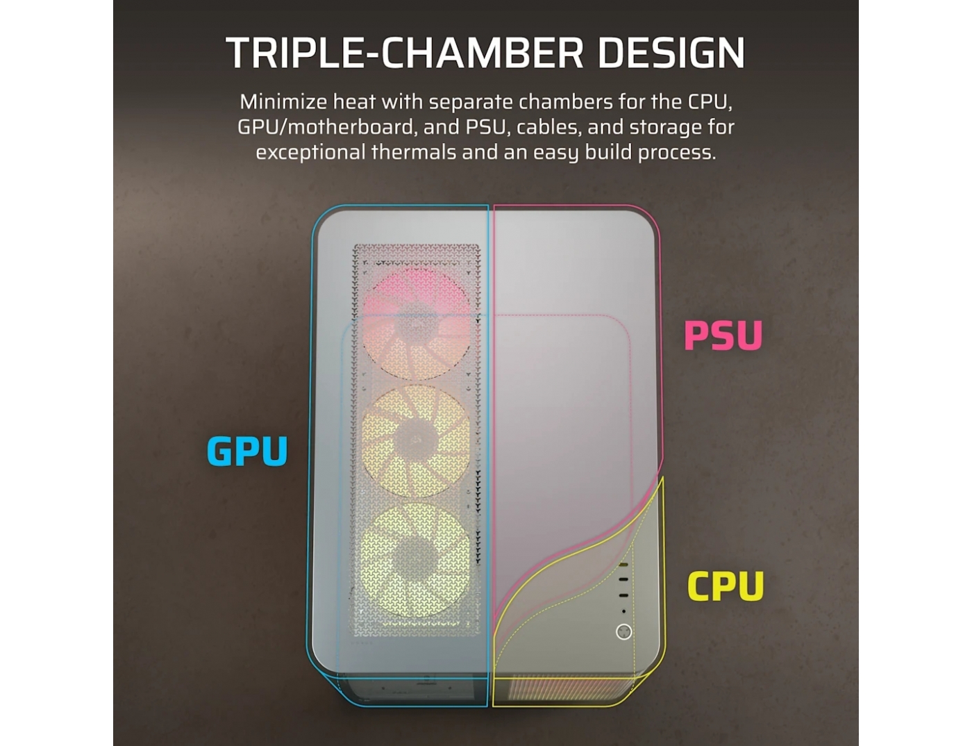 ένας μοναδικός σχεδιασμός τριπλού θαλάμου δημιουργήθηκε για την απομόνωση των θερμών εξαρτημάτων για αποτελεσματική ψύξη και μέγιστη απόδοση ανά πάσα στιγμή. οι ξεχωριστοί θάλαμοι για την cpu, την gpu/μητρική πλακέτα και το τροφοδοτικό, τα καλώδια και τον αποθηκευτικό χώρο επιτρέπουν εξαιρετική θερμική απόδοση και εύκολη διαδικασία κατασκευής υπολογιστή.